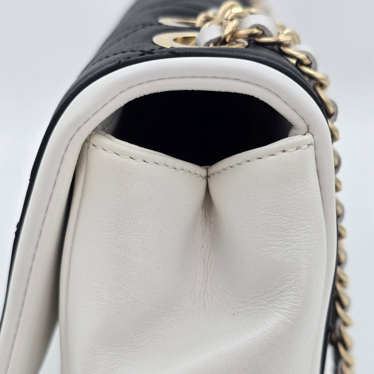 가방 정면에 옅은 얼룩감이 있고 가방 후면에는 옅은 정도의 체인 눌림 자국이 있습니다.