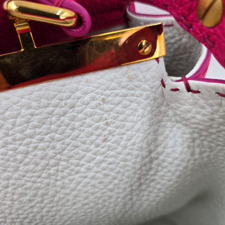 가방 내부 가죽에 부분적으로 잔 얼룩감이 있고 바닥면 이음새에 잔 먼지감이 있습니다.