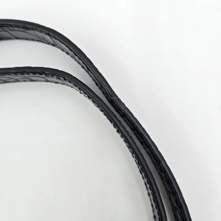 가방의 후 면에서 앞으로 이어진 가죽 띠를 고정하는 금속에 푸른 빛을 띄는 보호 필름이 부착되어 있습니다.