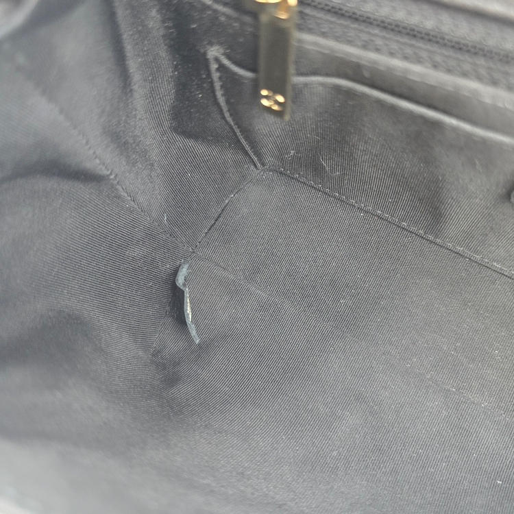 내부 안감에는 희끗한 이염감이 부분적으로 있고, 모서리 이음새에 잔 먼지감이 옅게 있습니다.