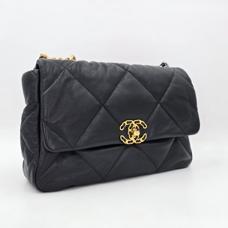 정면에 위치한 CC로고 디테일과 여닫이 금속에는 잔 기스감과 같은 사용감이 있습니다.