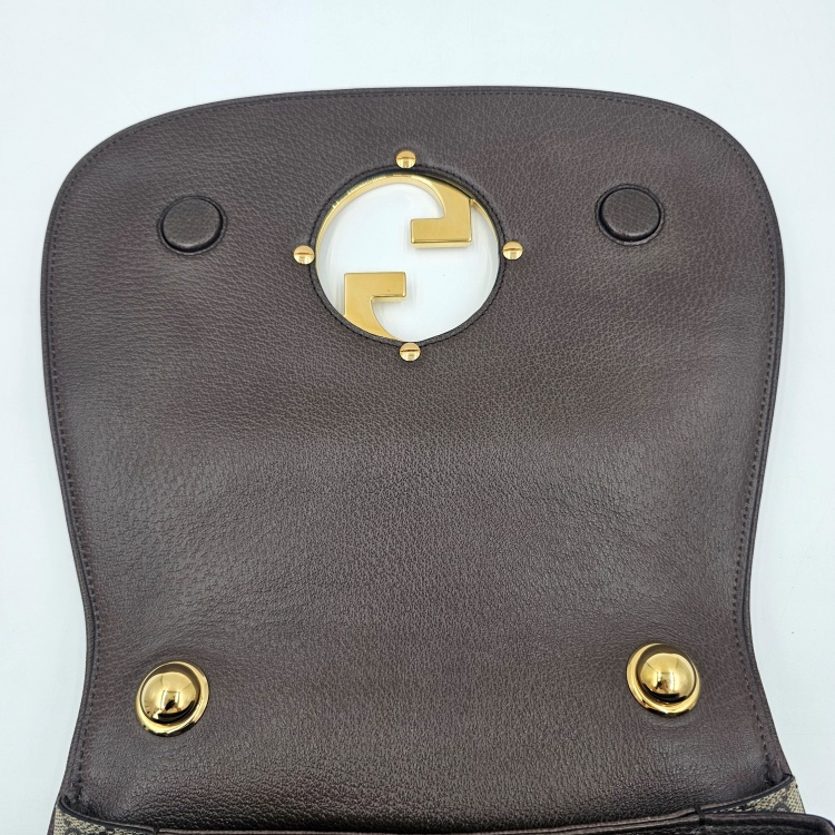 정면에 위치한 GG 금속 디테일에 잔기스감과 점 형태의 찍힘 자국이 있습니다.