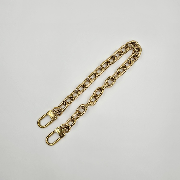 체인 핸들과 가죽 스트랩이 가방과 연결되는 금속 고리에