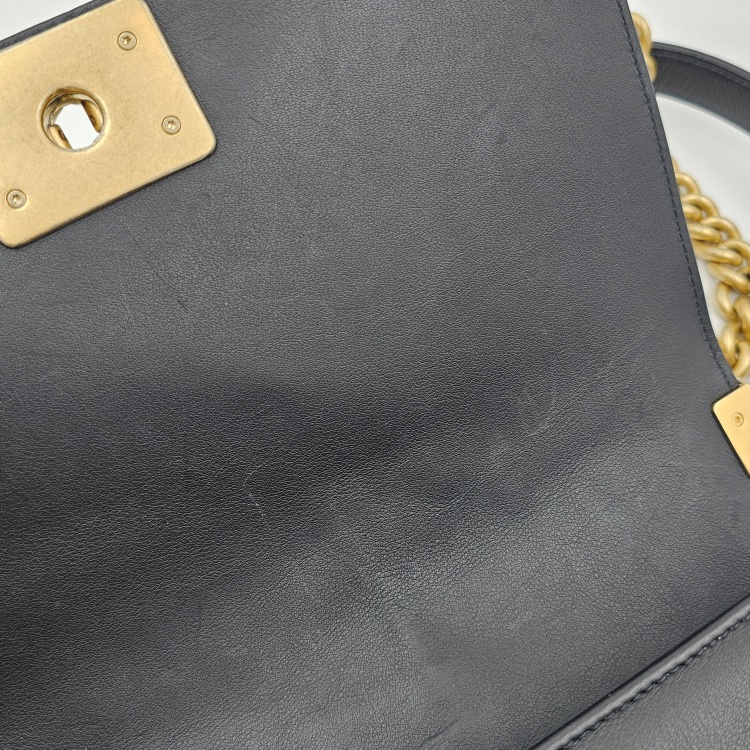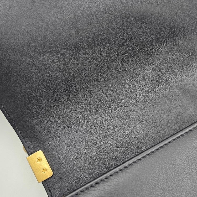 정면에 위치한 잠금 장치 디테일과 체인 스트랩에는 잔 기스감이 있으나 옅은 정도 입니다.
